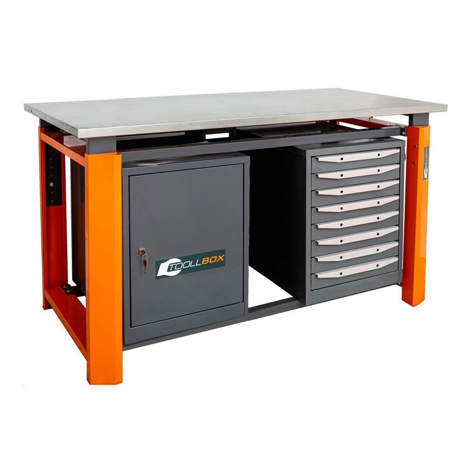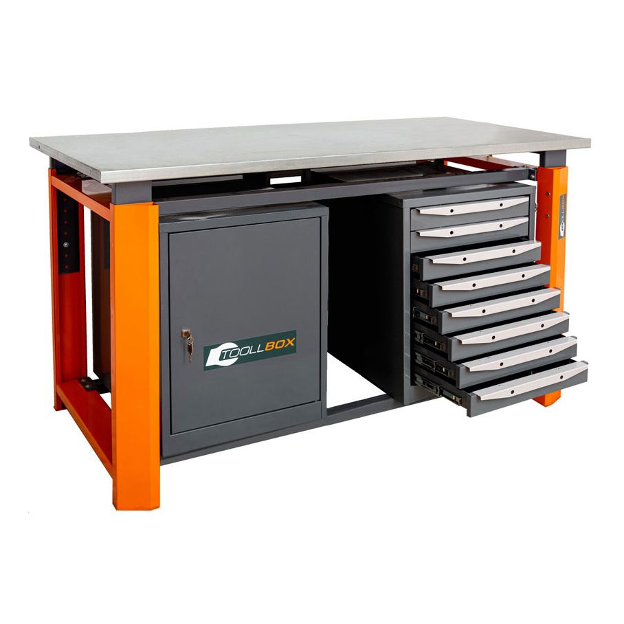 Верстак ТВР1800 (ТВ0-ТВ8) — это основательное рабочее место для мастерской, сервисной зоны или производственного участка, где важны не только прочность, но и удобная организация инструмента. Модель выполнена в двухтумбовом комбинированном формате: с одной стороны расположена тумба с восемью выдвижными ящиками, с другой — тумба с дверцей и двумя полками. Такой вариант особенно удобен там, где нужно держать под рукой и мелкую оснастку, и более крупные предметы.