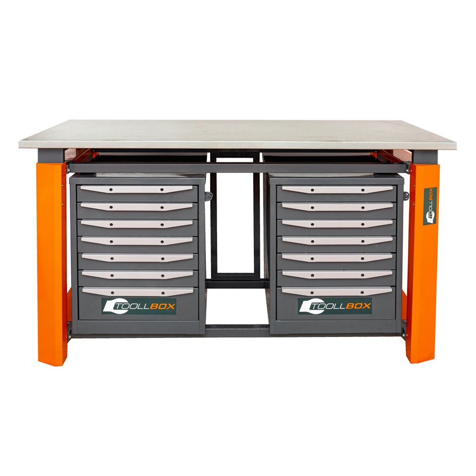 В комплектацию входят две тумбы ТВ7, каждая из которых оснащена семью ящиками. Такое решение помогает удобно распределить содержимое по назначению: отдельно разместить измерительный инструмент, крепеж, мелкие детали, расходники и рабочие принадлежности, чтобы все необходимое было под рукой и не занимало место на столешнице. В итоге верстак остается аккуратным и действительно удобным в ежедневной работе.
